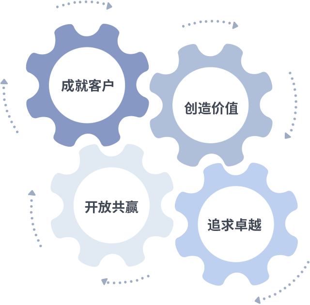 成就客户是一切决策的出发点,创造价值是衡量所有工作的标准,追求卓越是美狮贵宾会做事做人的态度,开放共赢是美狮贵宾会的格局也是最终的结果。价值观的齿轮环环相扣,推动着组织里的每个人不断向前。